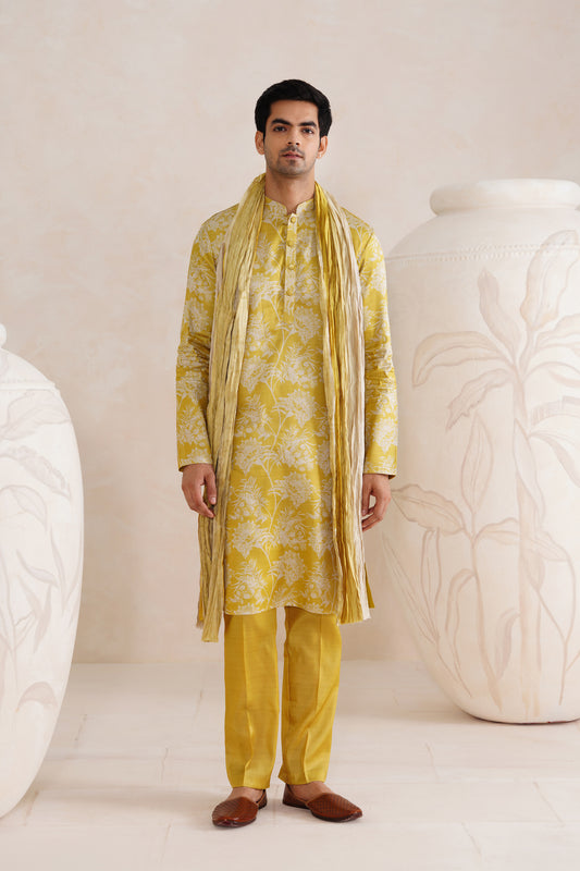 Yellow Tussar Print Kurta Set With Crush Ombre Dupatta