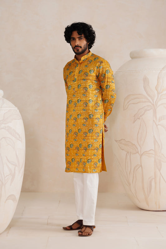 Yellow Jaipuri Tussar Ghicha Silk Kurta Set