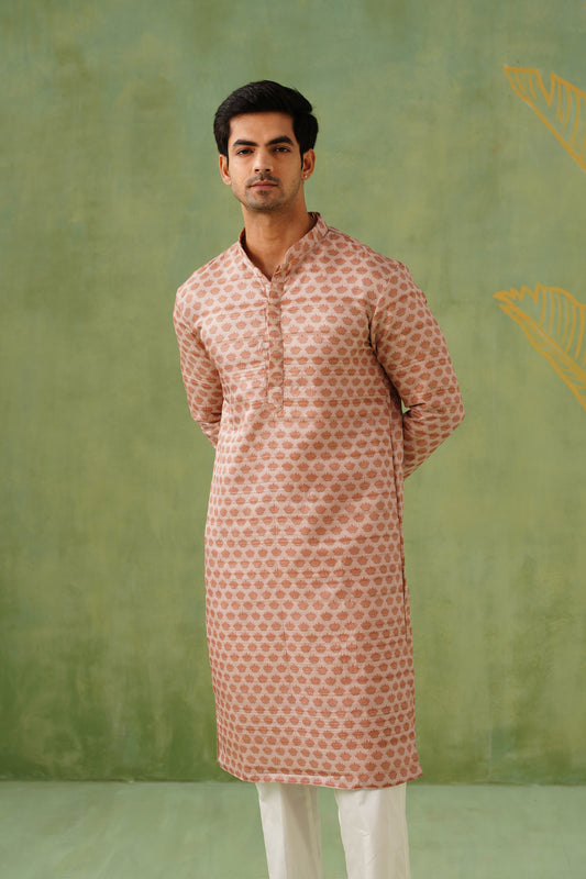 Peach Ghicha Print Kurta Jacket Set