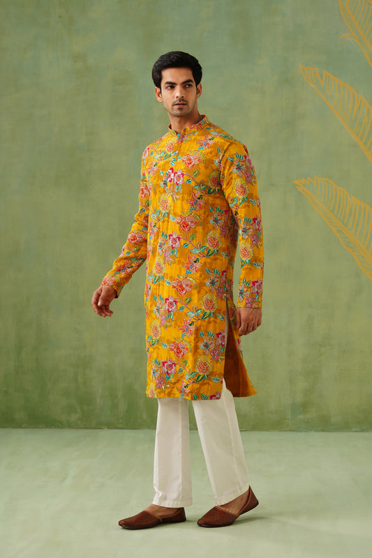 Yellow Gold Embroidery With Floral Print Kurta Patiyala Set