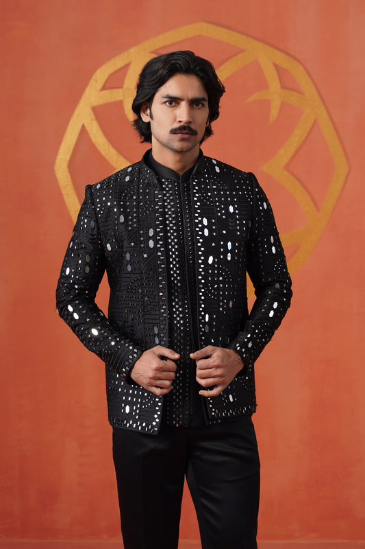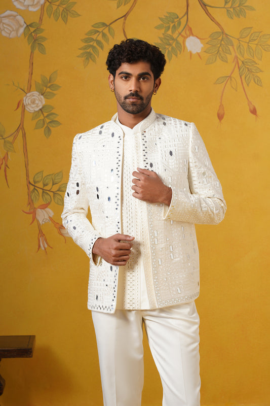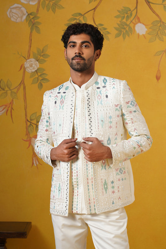 Cream Ikkat Mirror Embroidery Jodhpuri Set