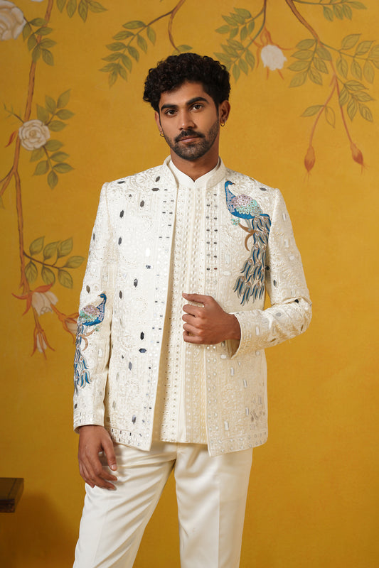 Cream Peacock Mirror Embroidery Jodhpuri Set
