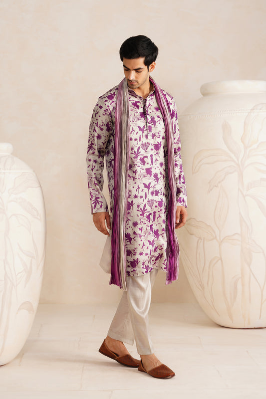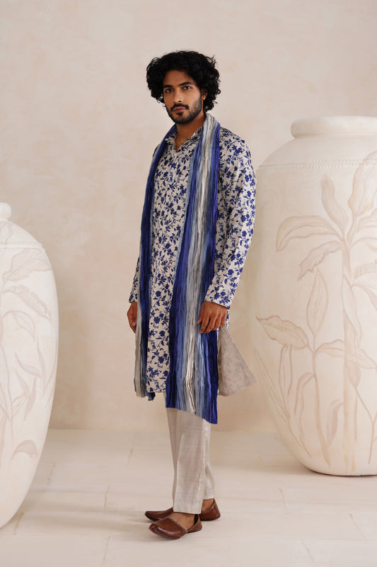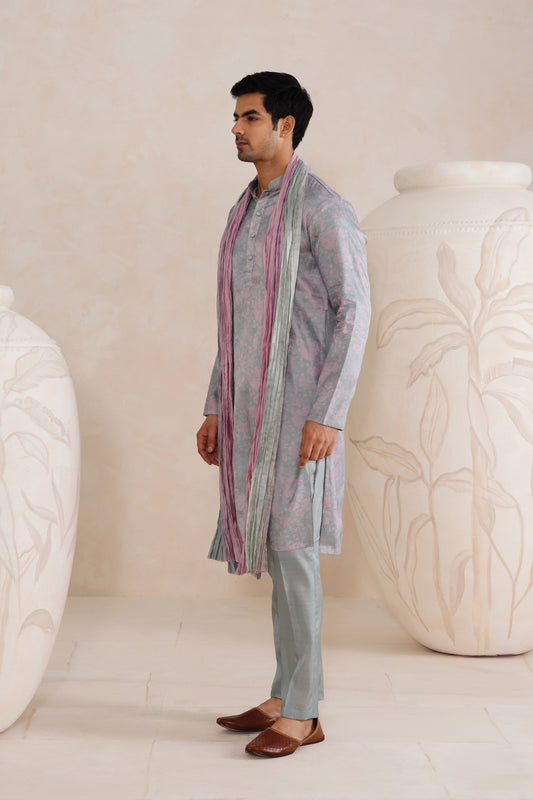 Cloud Grey Tussar Silk Print Kurta Set With Crush Ombre Dupatta