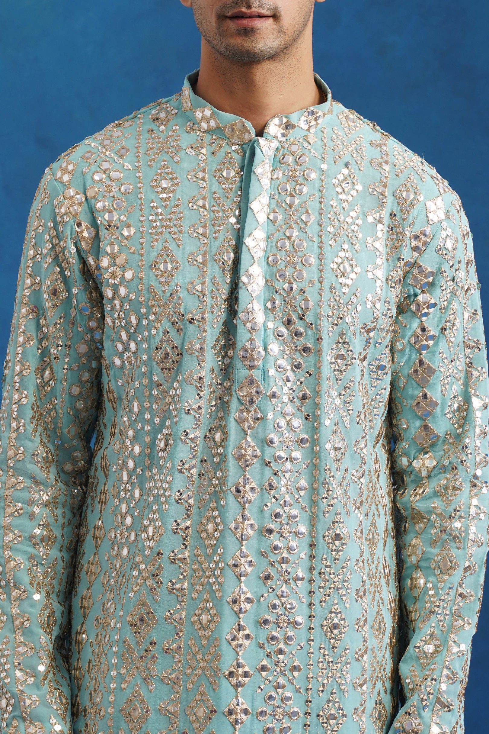 Rendered in soothing sky blue georgette, this kurta set showcases mirror and sequin embroidery that subtly catches the light. The soft drape enhances comfort while maintaining a structured festive presence. Paired with a coordinated patiyala, it’s an ideal choice for daytime celebrations and intimate gatherings.