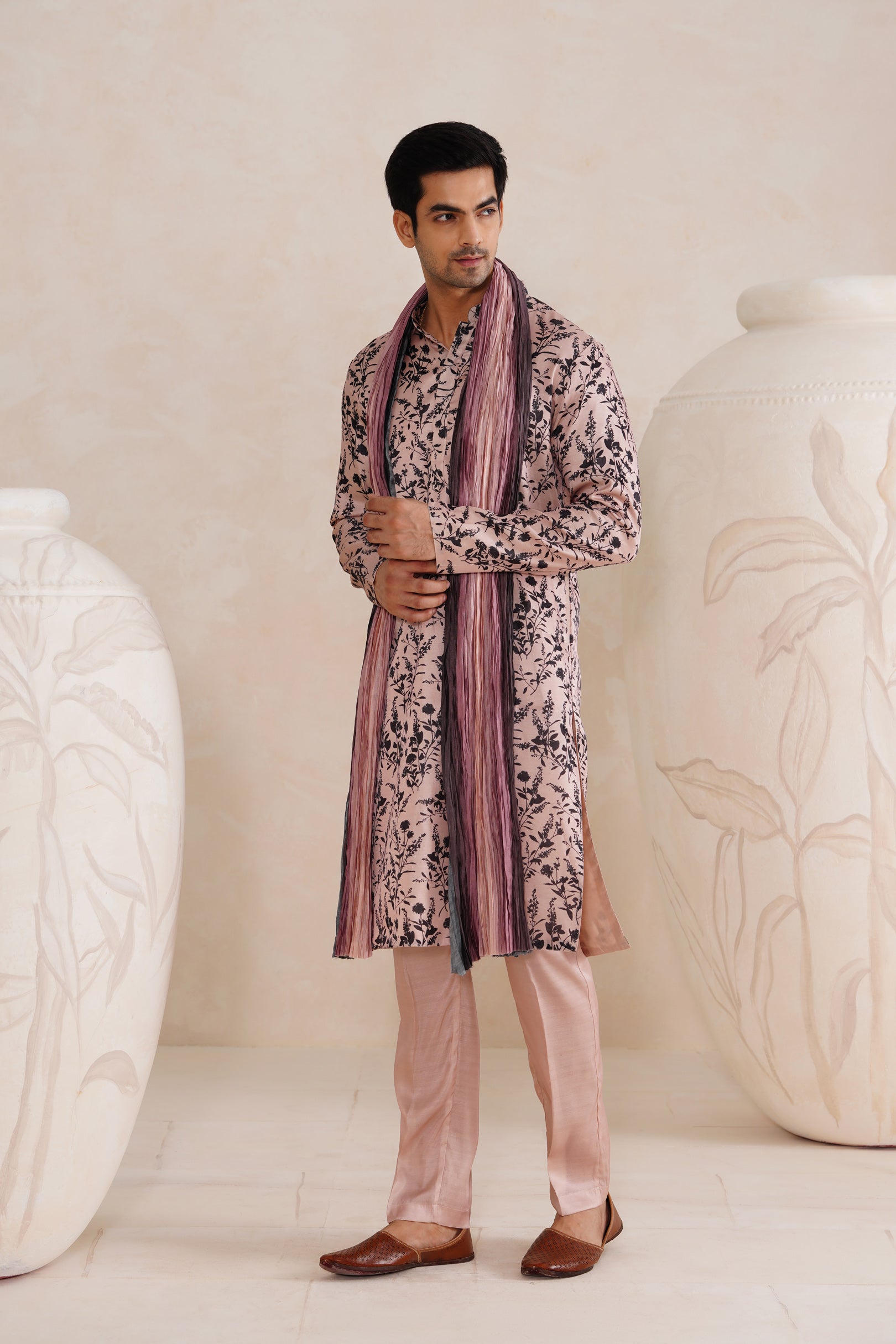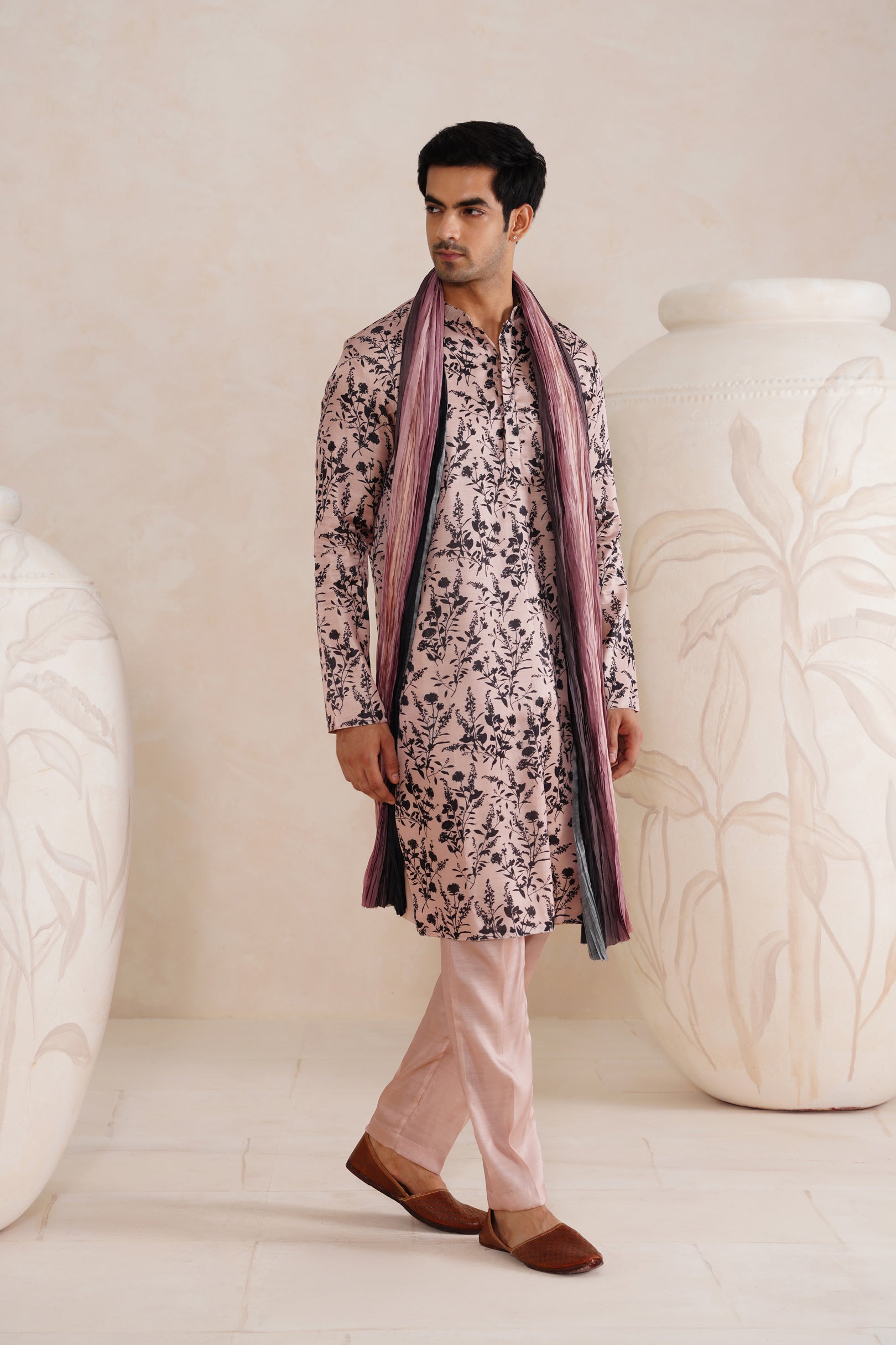 This pastel-toned kurta set is a celebration of softness and gentle florals. Crafted in a Tussar silk blend, the baby pink fabric is light and breathable, perfect for spring and summer occasions. The crushed ombré dupatta enhances the drape with a romantic air. It’s effortlessly elegant—ideal for brunches, festive teas, or casual ethnic soirees.