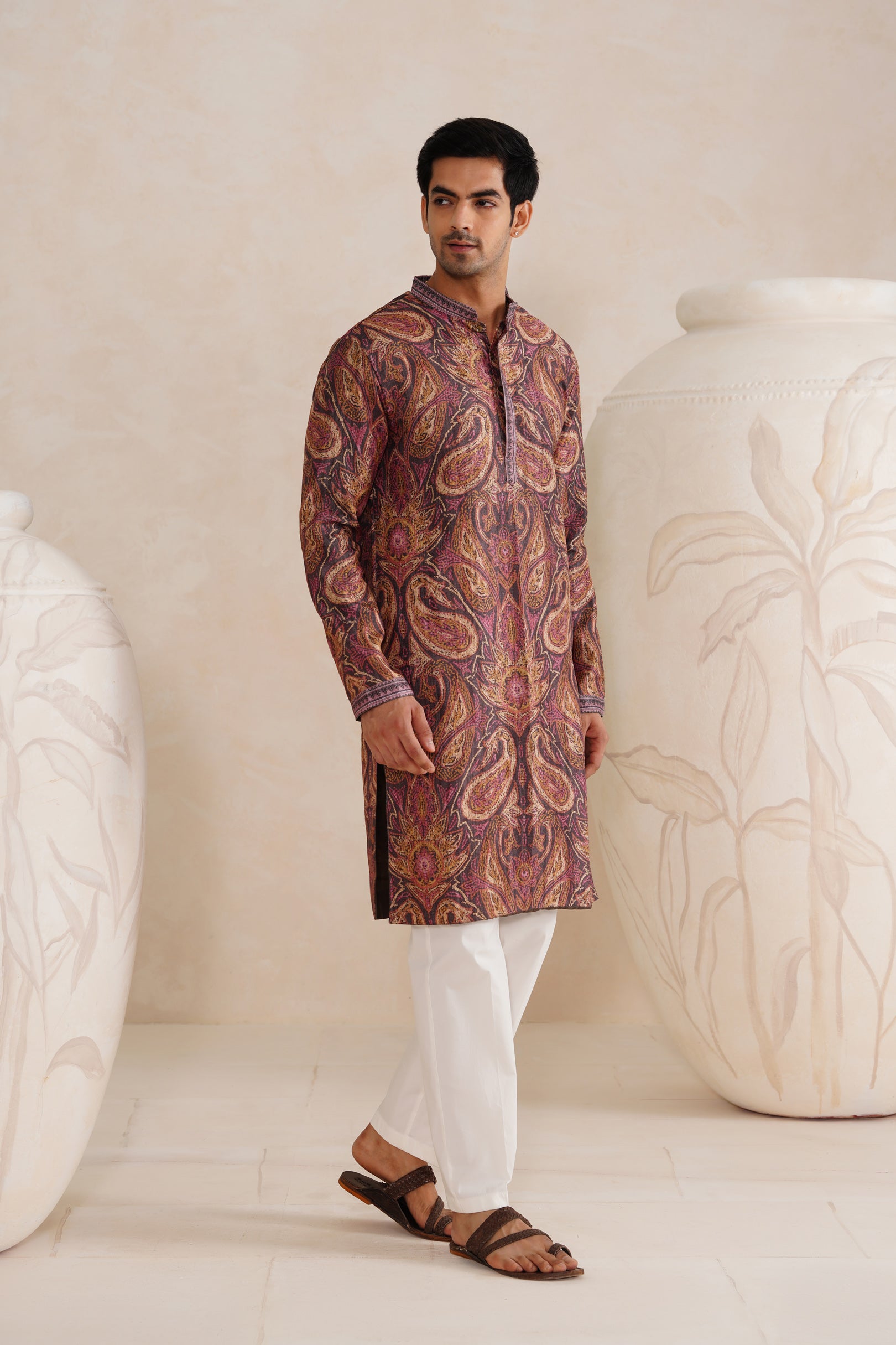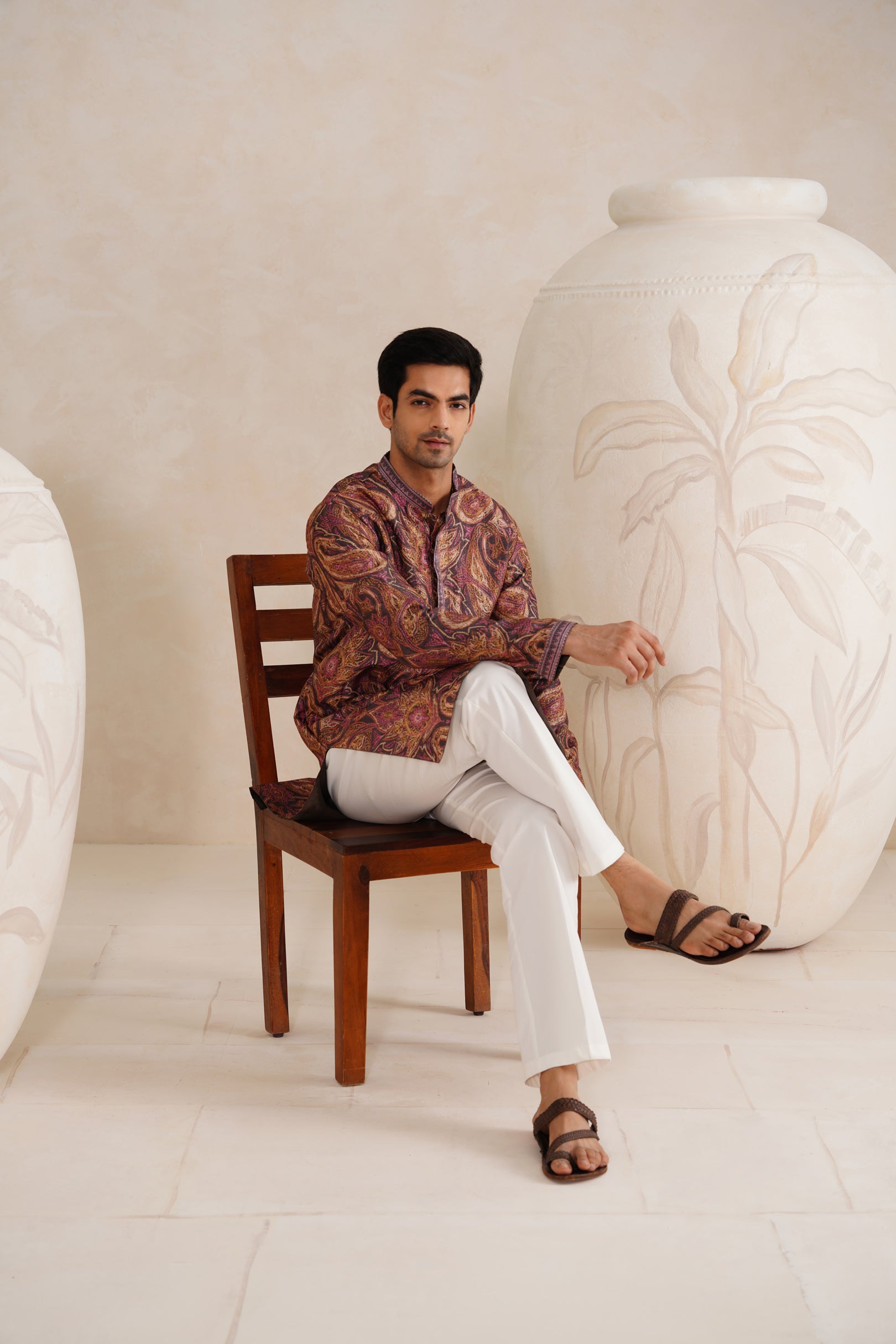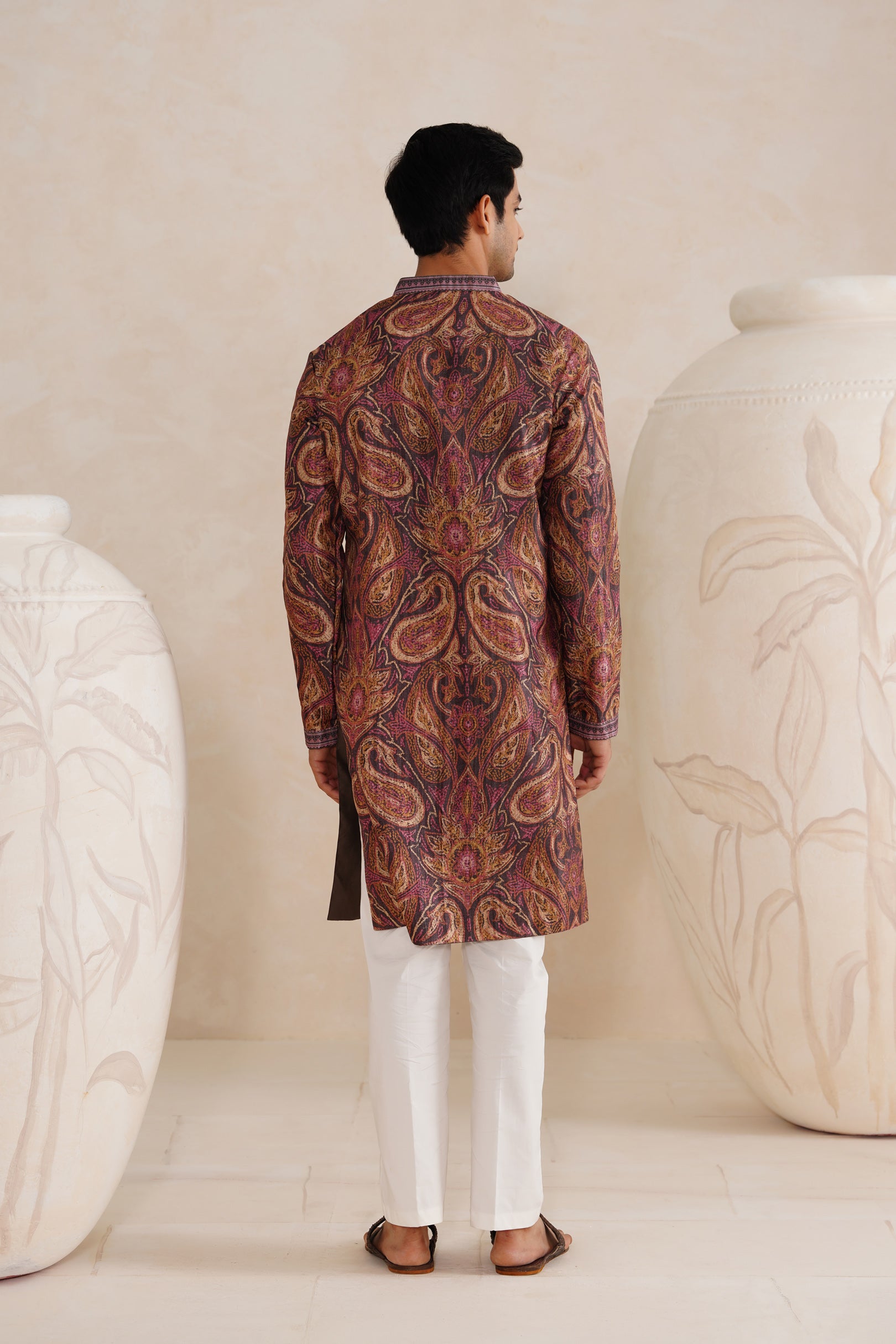 This kurta set draws from Mughal-inspired design, with subtle paisley motifs layered over an earthy brown Ghicha silk base. The blend’s raw texture lends an artisanal depth, ideal for those who appreciate understated luxury. A perfect day-to-evening piece, it combines warmth, structure, and heritage with quiet strength. Style it with mojaris and minimal accessories for full impact.
