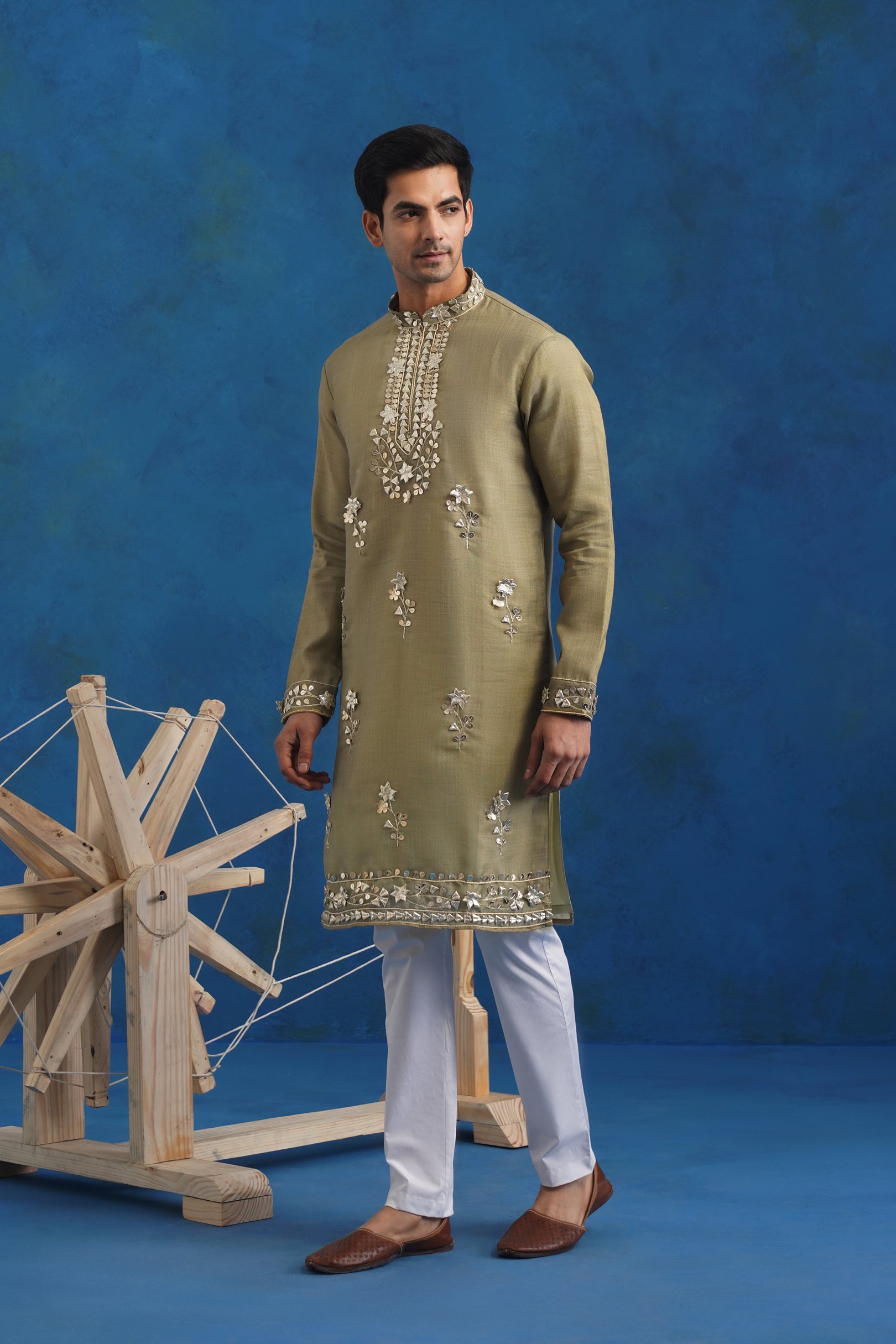 Crafted in textured green tussar silk, this kurta set is elevated with detailed mirror and gota hand embroidery. The natural sheen of tussar enhances the handcrafted embellishment, creating depth and dimension. Designed for festive occasions, it offers a refined blend of heritage craftsmanship and modern finishing.