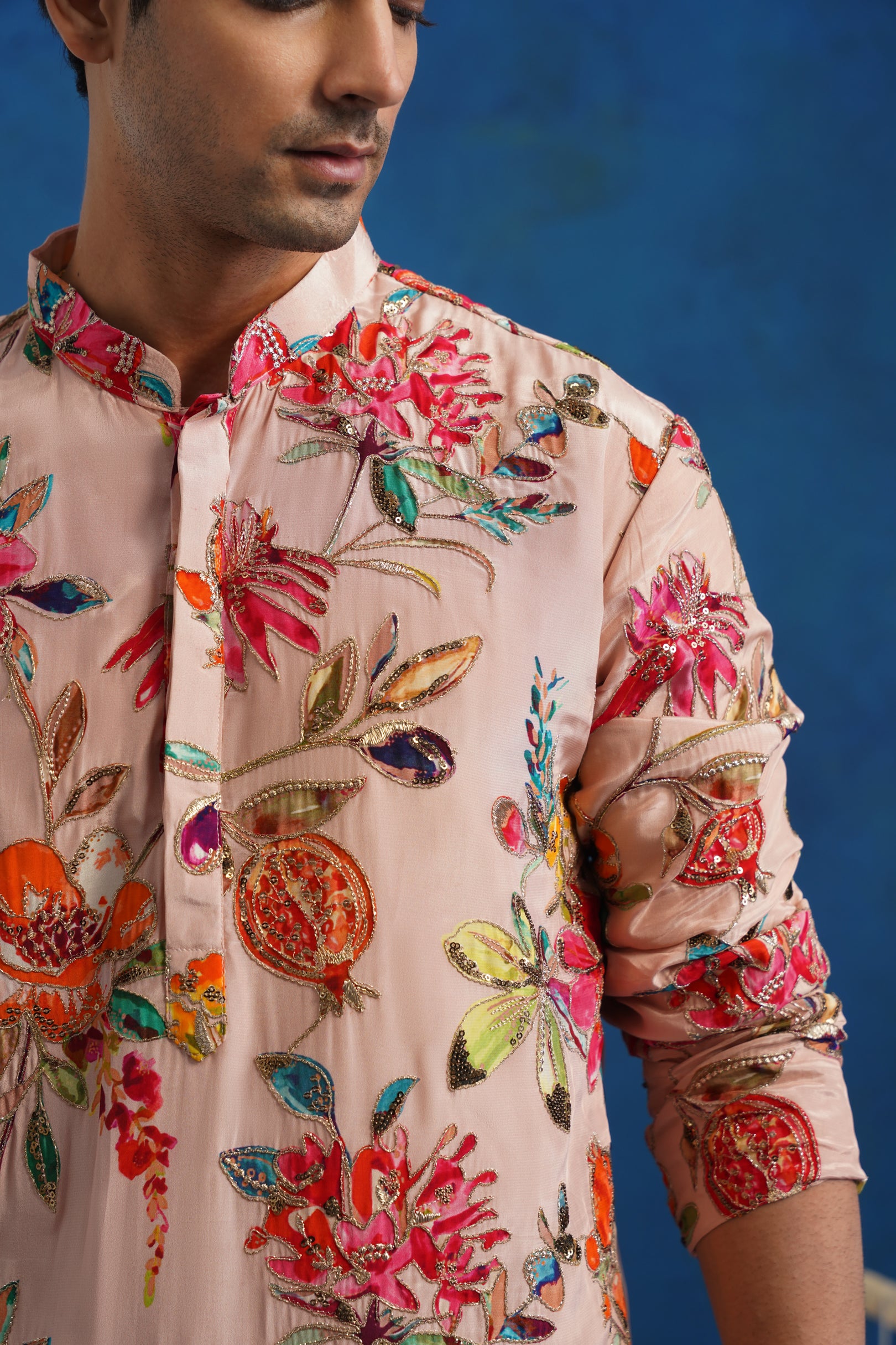 Designed in blush pink natural crepe, this kurta set features floral-inspired bead embroidery layered over a subtle printed base. The interplay of texture and pattern adds dimension without heaviness. The fabric offers a refined drape, making it ideal for daytime celebrations and pre-wedding gatherings.
