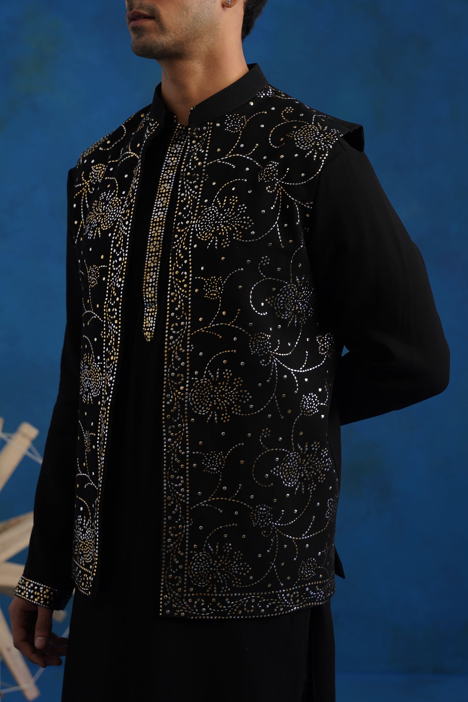 Designed in fluid georgette, this kurta jacket set is adorned with delicate makesh embroidery that adds fine metallic texture. The matching dupatta completes the layered ensemble with cohesion. Crafted for wedding celebrations, it blends traditional embellishment with contemporary tailoring.