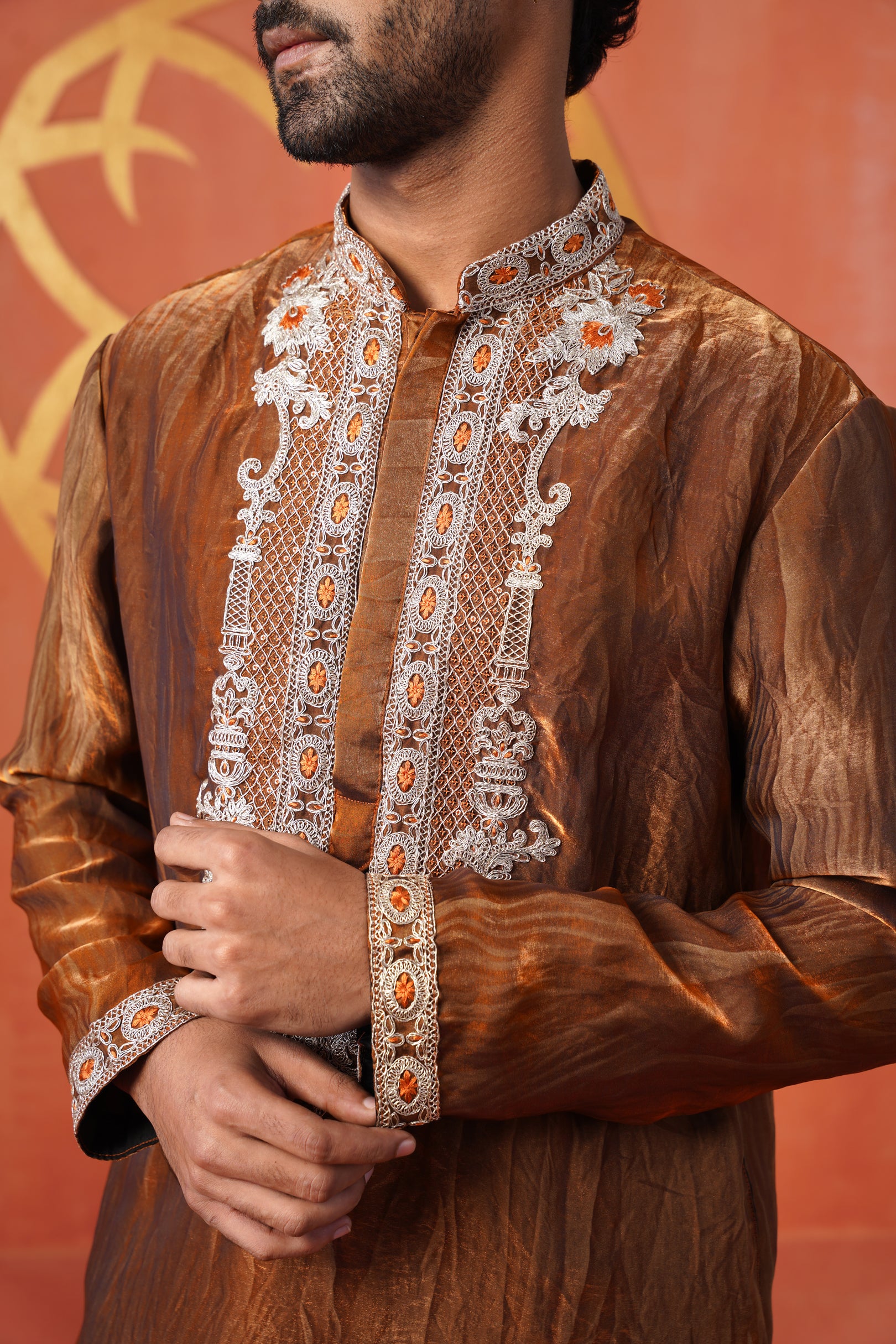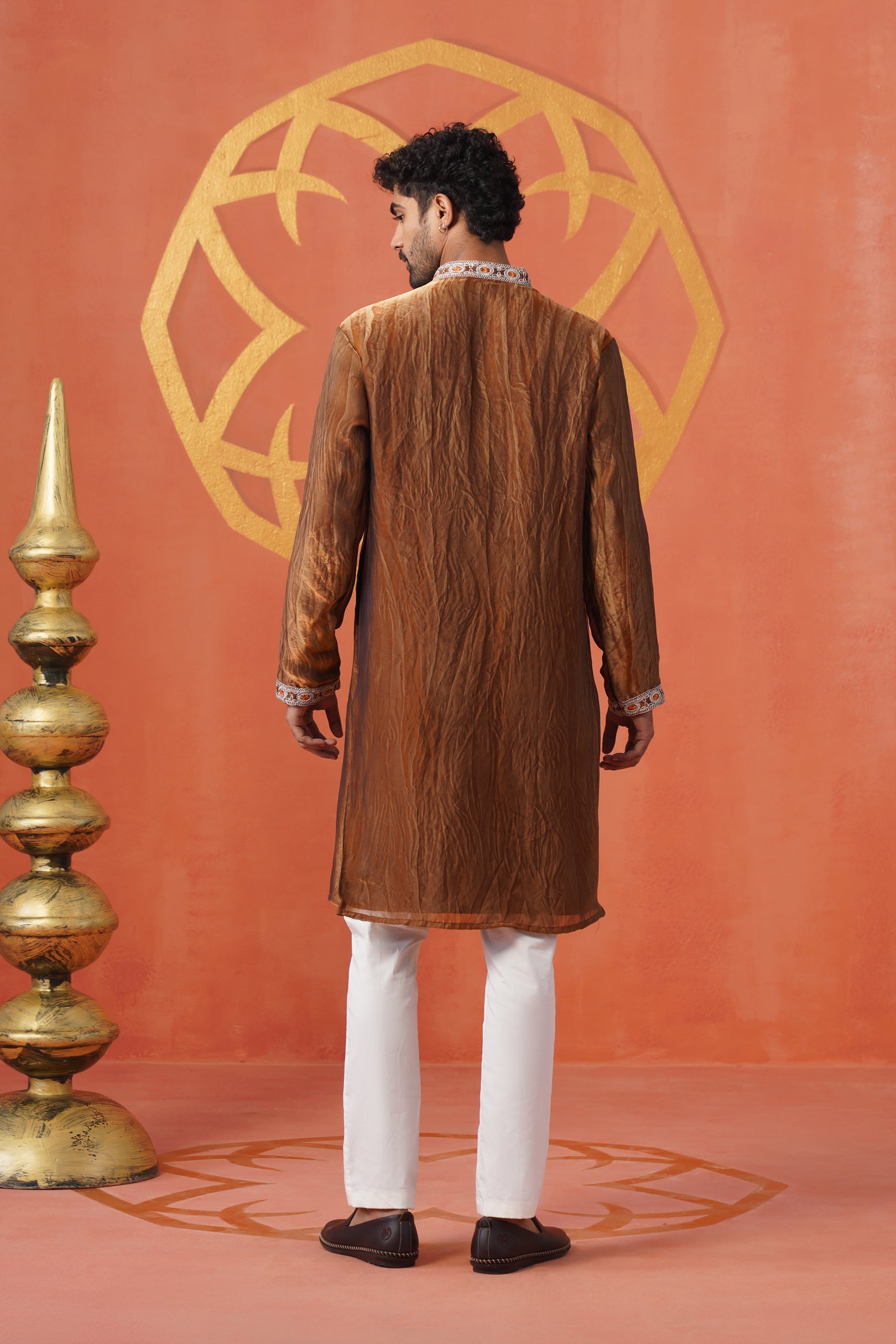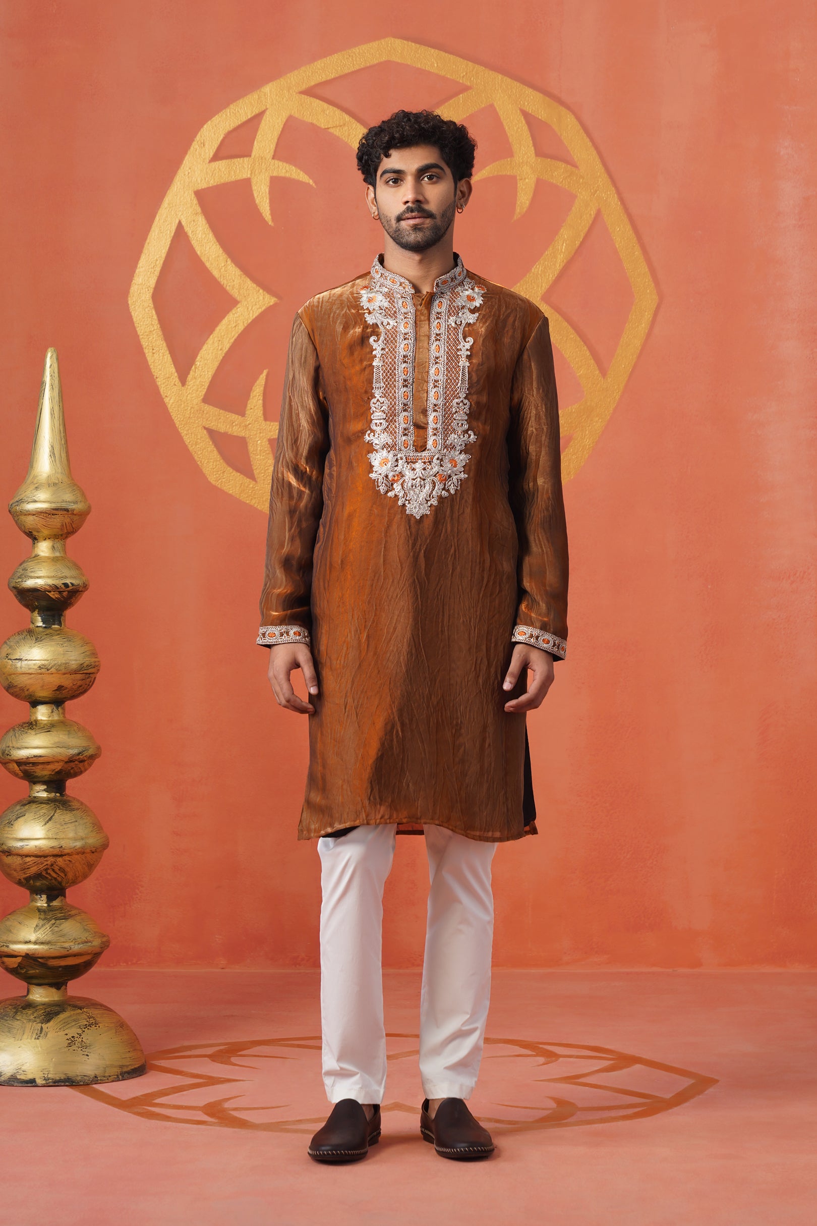 Crafted in hand-dyed tissue, this kurta features delicate embroidery that blends seamlessly with the warm rust palette. The fabric offers an airy feel with a gentle shine, perfect for celebrations. Paired with matching bottoms, the look is both polished and comfortable. Ideal for festive gatherings, poojas, and family events.